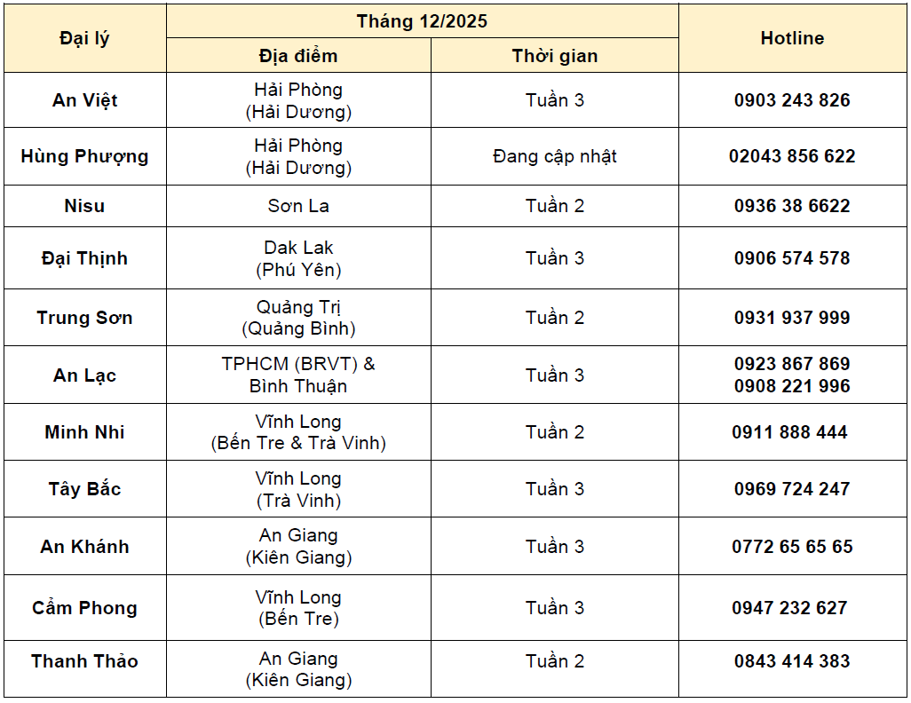 LỊCH BẢO DƯỠNG VÀ SỬA CHỮA LƯU ĐỘNG TẠI HỆ THỐNG ĐẠI LÝ ISUZU THÁNG 12/2025